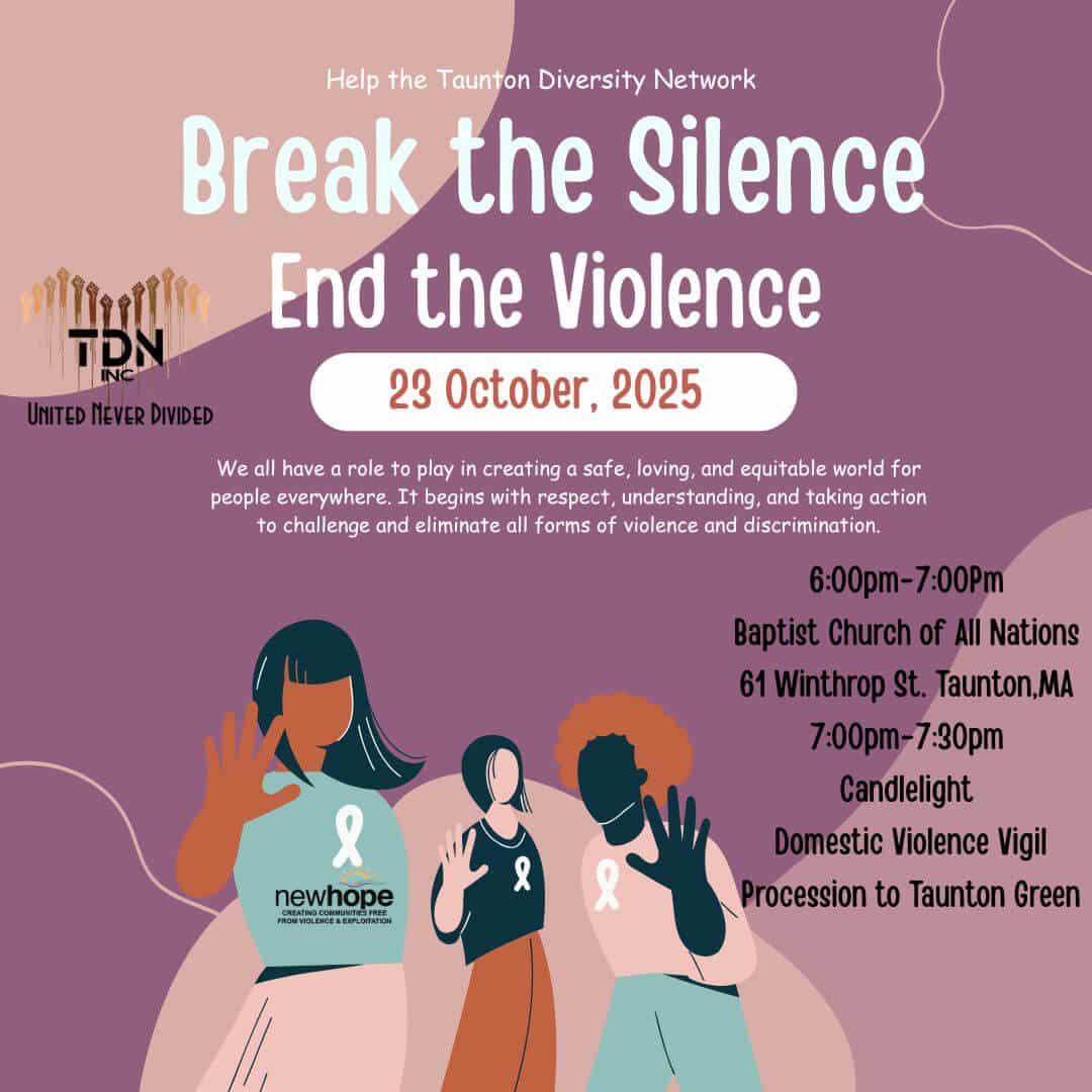 The Taunton Diversity Network and New Hope, Inc. invite you to come together as a community to Break the Silence and End the Violence. This is a time to honor survivors, remember those we’ve lost, and reaffirm our commitment to creating a safe, loving, and equitable world.